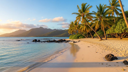 Experience a tranquil tropical paradise with palm trees swaying gently in the breeze, framed by majestic mountains and warm golden sunlight.