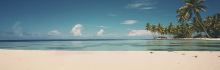 Panoramic view of tropical beach with coconut palm trees, blue sky and white sand