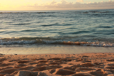 View of the sandy beach at sunset, Honolulu, Hawaii. Copy space for text