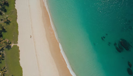 A stunning aerial view captures turquoise ocean waves gracefully crashing onto a sandy beach, framed by lush palm trees under a clear sky.