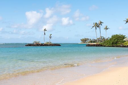 View of a beautiful tropical beach with white sand, palm trees, turquoise ocean with clouds on sunny summer day. Perfect landscape background for relaxing vacation, Rarotonga, Cook Island.