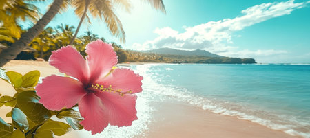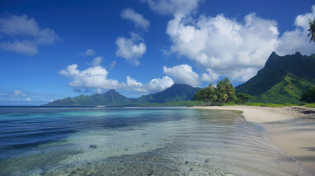 A vibrant beach scene showcases turquoise water meeting a sandy shore. Palm trees and lush vegetation line the coast beneath a partly cloudy sky. The composition emphasizes natural beauty with soft lighting and a sense of tranquility. A mountain range is visible in the distance.