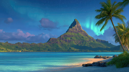 A vibrant landscape depicts a tropical island with a prominent mountain rising from the lush terrain. Turquoise water meets the sandy shore, while palm trees frame the scene. The image showcases natural beauty with vivid colors and a bright atmosphere suitable for various visual projects.