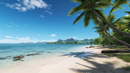 A picturesque tropical beach with palm trees casting long shadows on the white sand, and a clear blue ocean with gentle waves lapping at the shore.