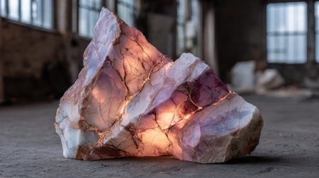 A vivid mineral formation glows with light through its translucent quartz, set against an abandoned industrial backdrop.