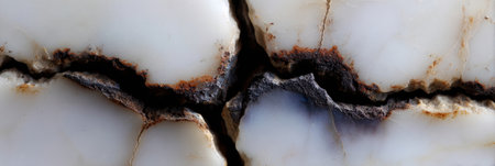Close up view of cracked marble showing contrasting colors and textures formed by natural processes over time.