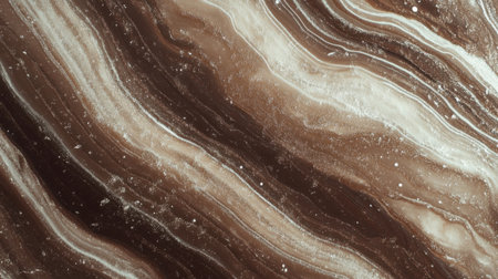 This elegant abstract marble texture features rich brown hues with contrasting white veins and shimmering particles, perfect for backgrounds and design projects.