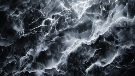 This stunning abstract image showcases a black and white marble texture with fluid patterns and shimmering highlights, perfect for various design and artistic applications.