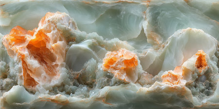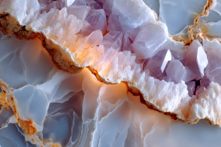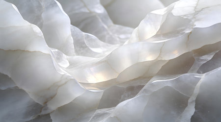 A creative digital illustration depicting Elegant artistic illustration of white onyx stone texture with translucent veins, macro view, soft backlighting, mystical luxurious depth. This AI-generated artwork features unique visual elements suitable for various commercial and editorial applications. AI-generated illustration.