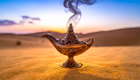 A detailed genie lamp rests on a desert dune, with smoke swirling from its spout under the warm glow of the setting sun.