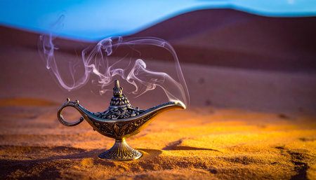 Magic lamp in the desert from the story of Aladdin with Genie appearing in blue smoke concept for wishing, luck and magic