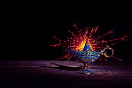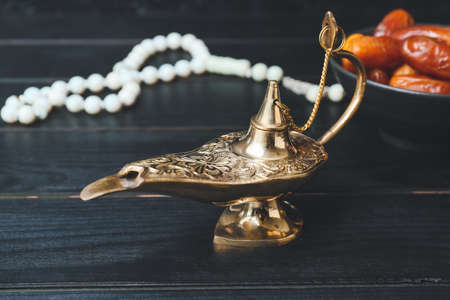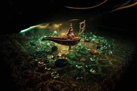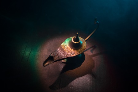 Magic Aladdin magic lamp on dark background. Lamp of wishes.