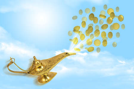 An arabic magic lamp, isolated on white, with loads of coins from around the world.