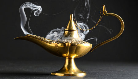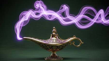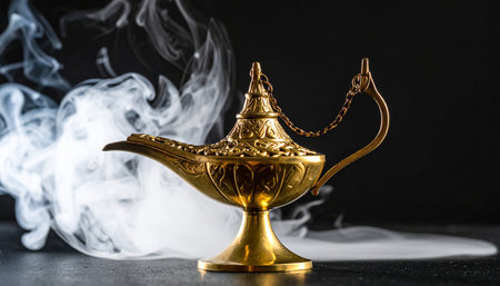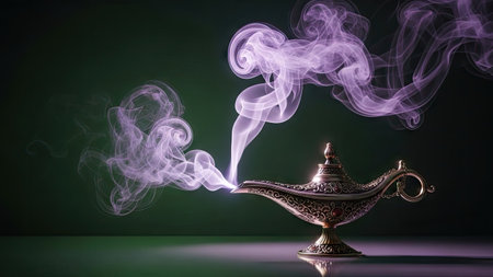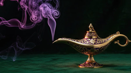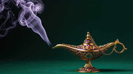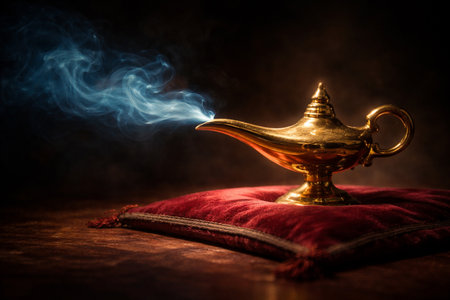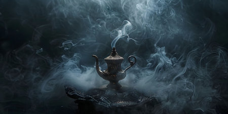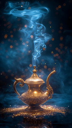 An ornate antique lamp emits wisps of smoke in a mysterious setting, creating an enchanting ambiance. The light reflects off its surface, adding to the magic of the moment.