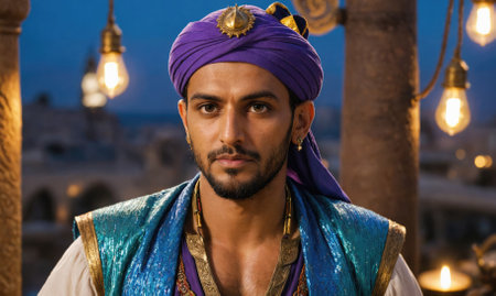 A man wearing a purple turban and blue and gold clothing looks directly at the camera