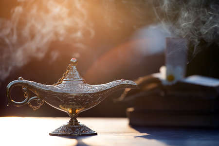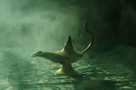 Magic lamp from the story of Aladdin in smoke. Concept for wishing, luck and magic
