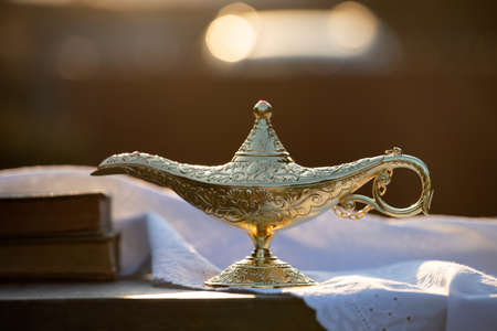 Magic Aladdin magic oil lamp on sand and bokeh background