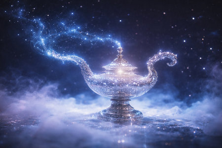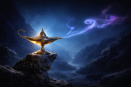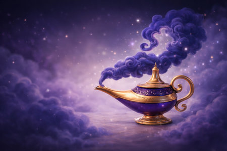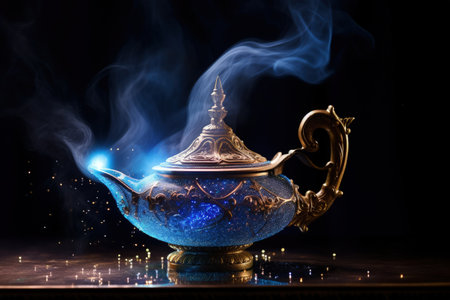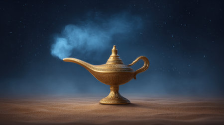 Aladdin s lamp with blue genie smoke symbolizing wishes luck and magic