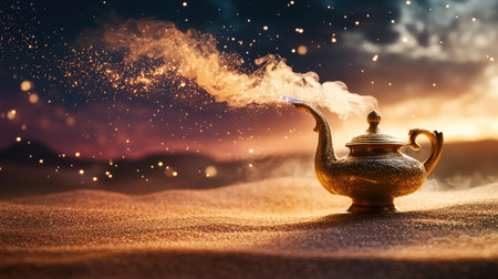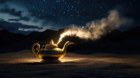 An enchanting golden teapot releasing wisps of smoke amidst the serene desert landscape under a starry night sky. This mystical image evokes feelings of magic and adventure.