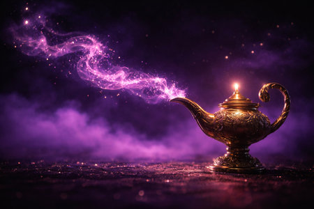 AI generated fantasy magic lamp with golden and purple tones surrounded by swirling mystic smoke and soft sparkling light on clean dark background suitable for design