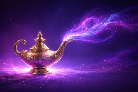 AI generated ancient golden magic lamp on glowing purple surface emitting swirling mystical energy and sparkling particles against dark dreamy background suitable for fantasy design and text space