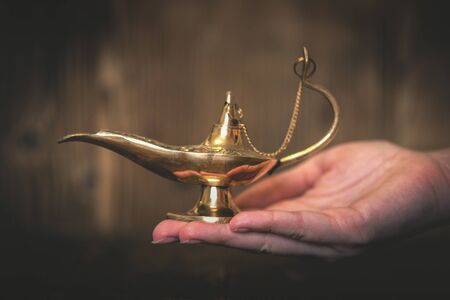 A golden Genie lamp in a woman hands on a wooden board background. Make a wish concept.
