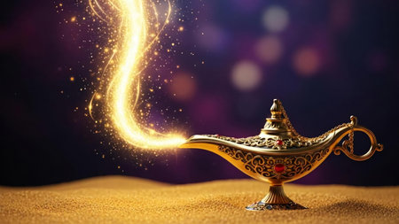 A captivating magic lamp radiates a warm glow and releases sparkling dust in a softly illuminated setting, perfect for evoking themes of fantasy and adventure.