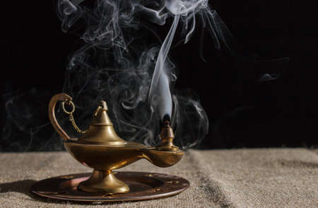 aladdin's magic lamp smokes on table. indoor closeup on black background