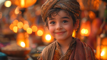 Ai Generative photo of a happy muslim boy with ramadan lanterns in streets