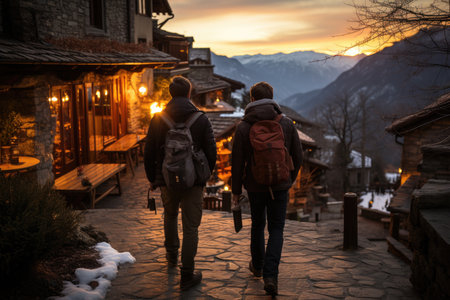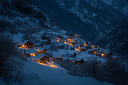 Festive Christmas market in snowy alpine village with wooden chalets glowing lights and decorated stalls at winter evening. Warm holiday atmosphere with mountain backdrop.