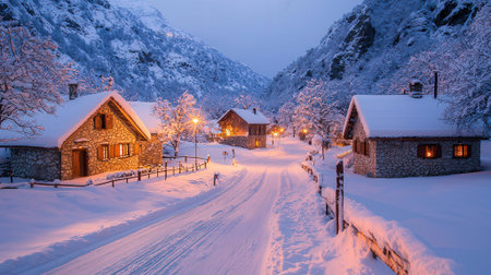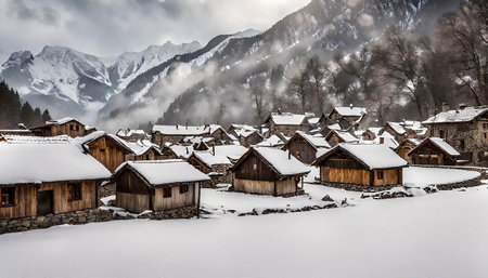 Snow Covered Mountain Village with Wooden Cabins in Winter Landscape.
