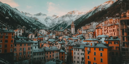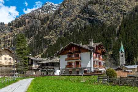 A picturesque view of the charming village of Gressoney-Saint-Jean with traditional wooden and stone buildings against a backdrop of mountain in the Aosta Valley, Italy