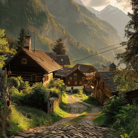 A picturesque alpine village features traditional stone houses with wooden accents, surrounded by lush green mountains and distant snow-capped peaks under a clear blue sky.