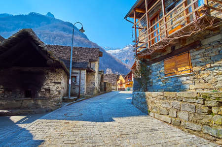 The street with vintage stone Alpine houses, the wall of one of houses is covered with carbon black, Sonogno village, Valle Verzasca, Switzerland