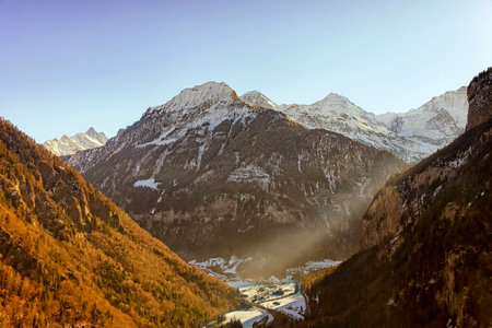 Morning mist in Italian Alps. View of the mountain forest valley at sunrise