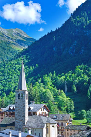 View of alpine houses and church in Pontechianale, a typical village in Varaita Valley, Piedmont, Italy