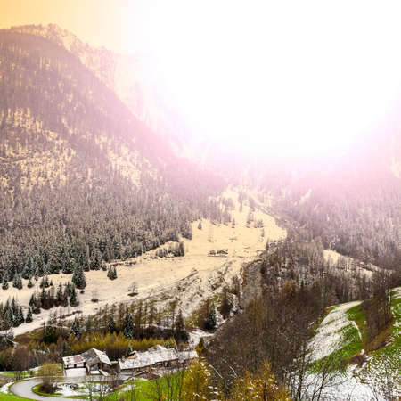 Several houses among the mountains in the early morning. You can see the lid of the church. There is snow in the mountains, the sun is shining.