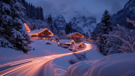 A magical winter scene with the soft glow of car light trails leading to inviting mountain chalets