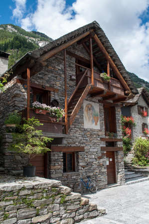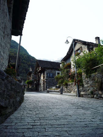 Sonogno small town in the swiss mountains. Street with old stone houses decorated with flowers.