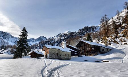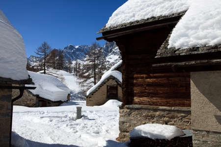 Devero Park ( Verbano-Cusio-Ossola ), Italy - January 15, 2017: Crampiolo village and houses in Alpe Devero Park, Ossola Valley, VCO, Piedmont, Italy