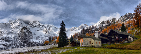 Mountain panorama with peaks, snow, villages, streams and trails near Alagna Valsesia, Italy