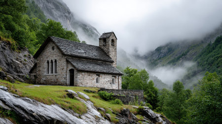 A small stone building with a steeple sits on a hillside in the fog. The building is surrounded by trees and rocks, and the fog adds a sense of mystery and seclusion to the scene