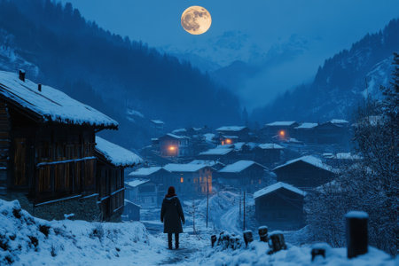 A person walks on a snow-covered path in a tranquil village illuminated by moonlight during dusk.