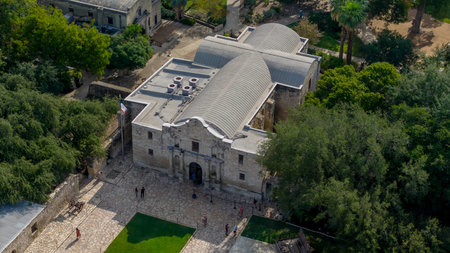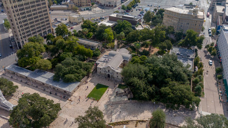 Sep 15, 2023-San Antonio, TX: Aerial view of the historic Spanish mission, the Alamo in San Antonio, Texas.