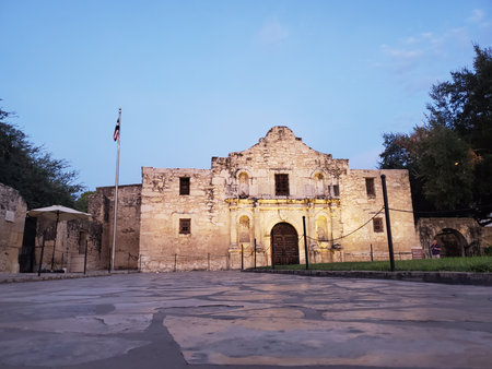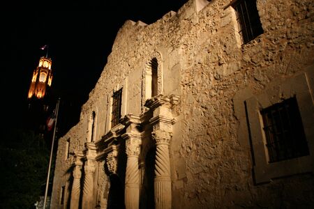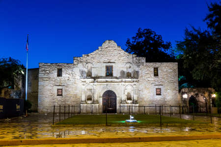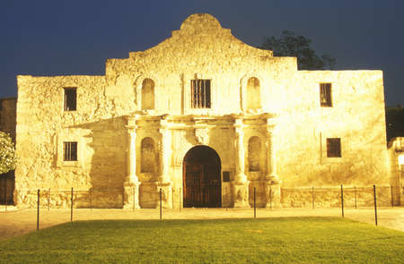 The Alamo Mission at night in downtown San Antonio, Texas, USA. The Mission is a part of the San Antonio Missions World Heritage Site.
