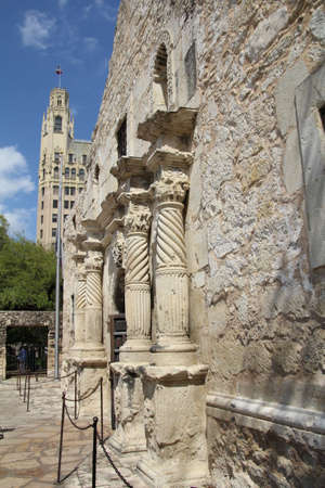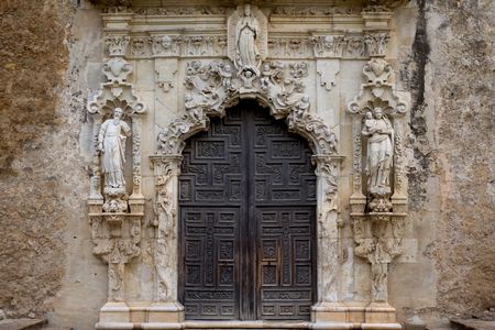 The texture of a rock wall and ornate stonework at the entrance of The Alamo in San Antonio, Texas