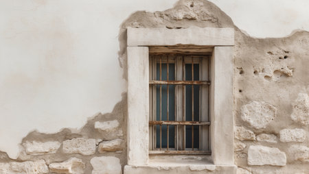 A captivating image of an old window with rusty bars set in a weathered stone wall. The textures and colors evoke a sense of history and decay, rich in architectural detail.