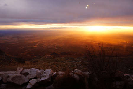 Panorama of majestic sunset over the Chihuahuan Desert and the city of Albuquerque, New Mexico, as seen from the peak of the Sandia Mountains