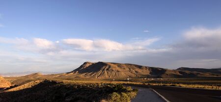 New Mexico scenic travel. Pink tinged Mountain and clouds in south east NM USA. Route 285 between Roswell and Vaughn