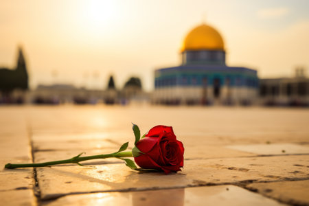 Red rose on the background of the dome of the mosque at sunset